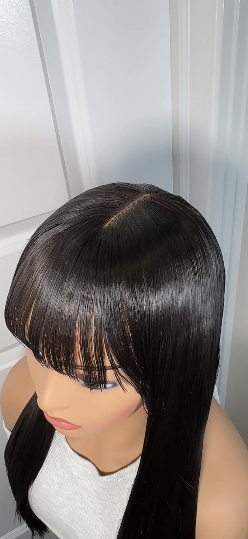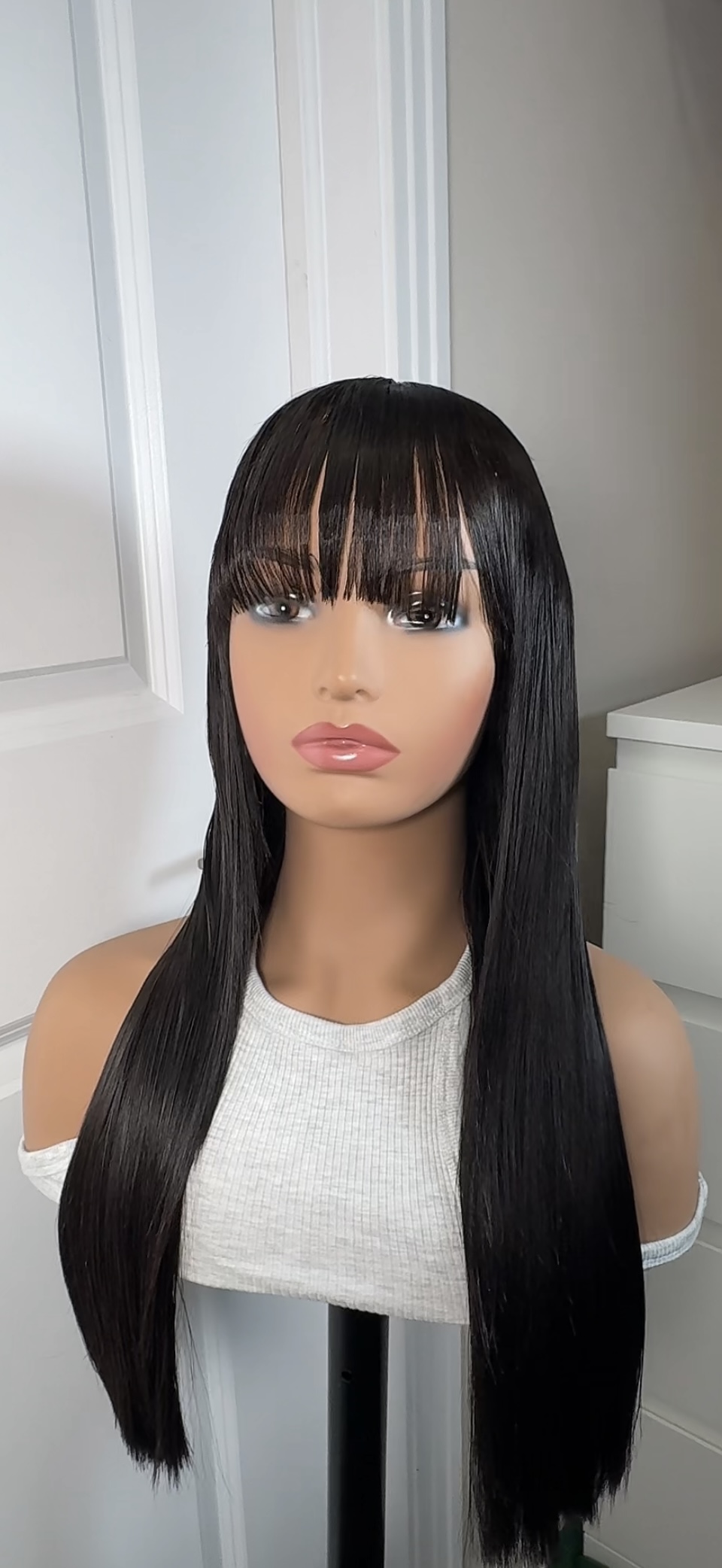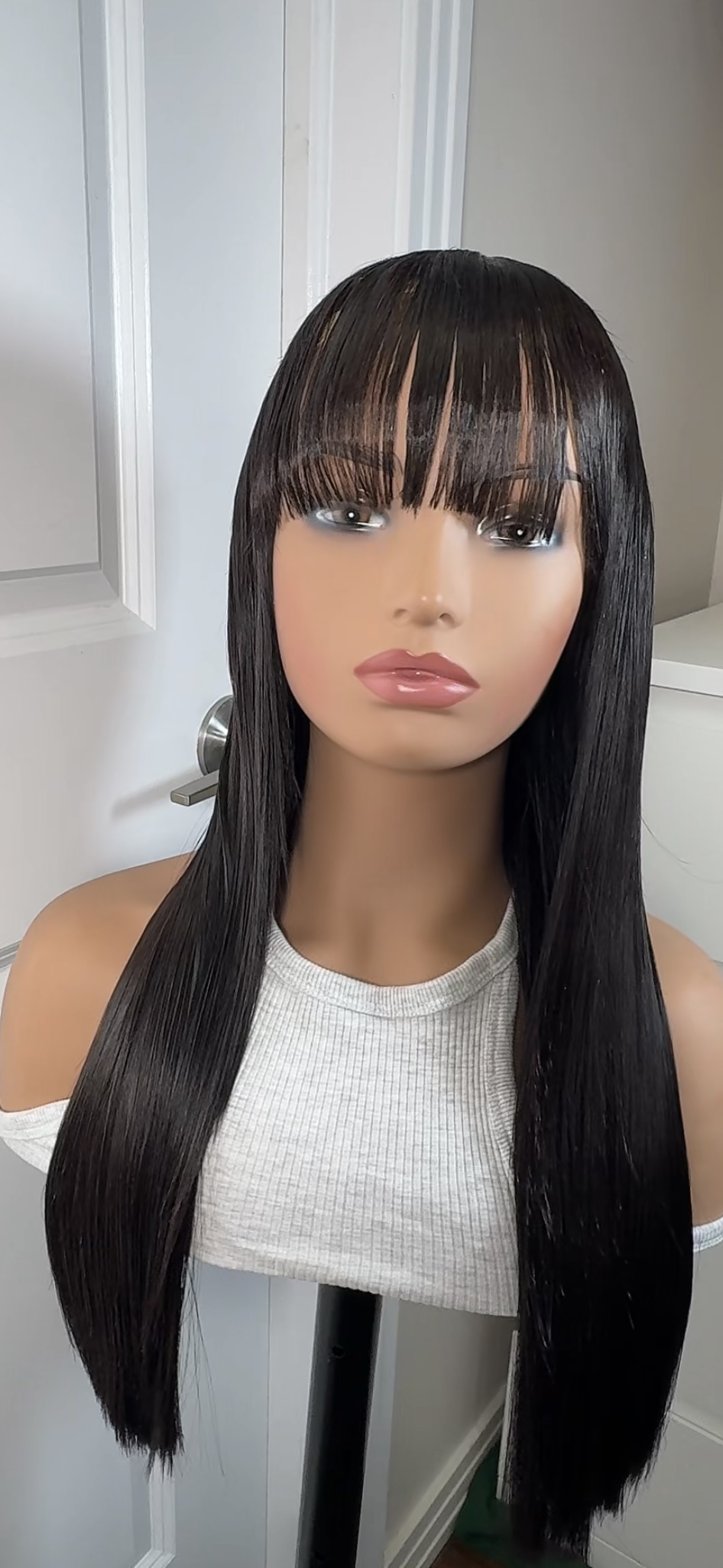 The ISA Hair Bangs Wig offers a sleek, straight style with rich bangs for a natural, trendy look. Crafted from high-quality, heat-resistant hair, it provides a comfortable and secure fit with adjustable straps. Perfect for everyday wear or special occasions, this wig adds a chic touch with its stylish bangs and lightweight design.